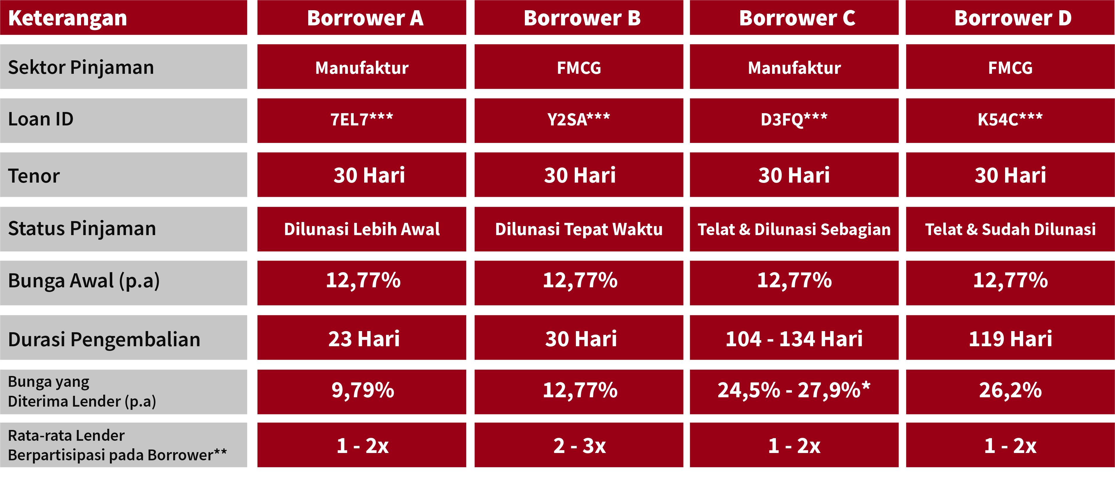 Dari sektor FMCG, borrower ini menunjukkan ketepatan dalam membayar pinjaman sesuai tenor 30 hari. Konsistensinya dalam memenuhi kewajiban membuatnya menjadi salah satu borrower yang dipercaya oleh lender, terlihat dari frekuensi pendanaan ulang yang cukup tinggi, yakni 2–3 kali. Lender pun mendapatkan imbal hasil penuh sebesar 12,77% p.a.