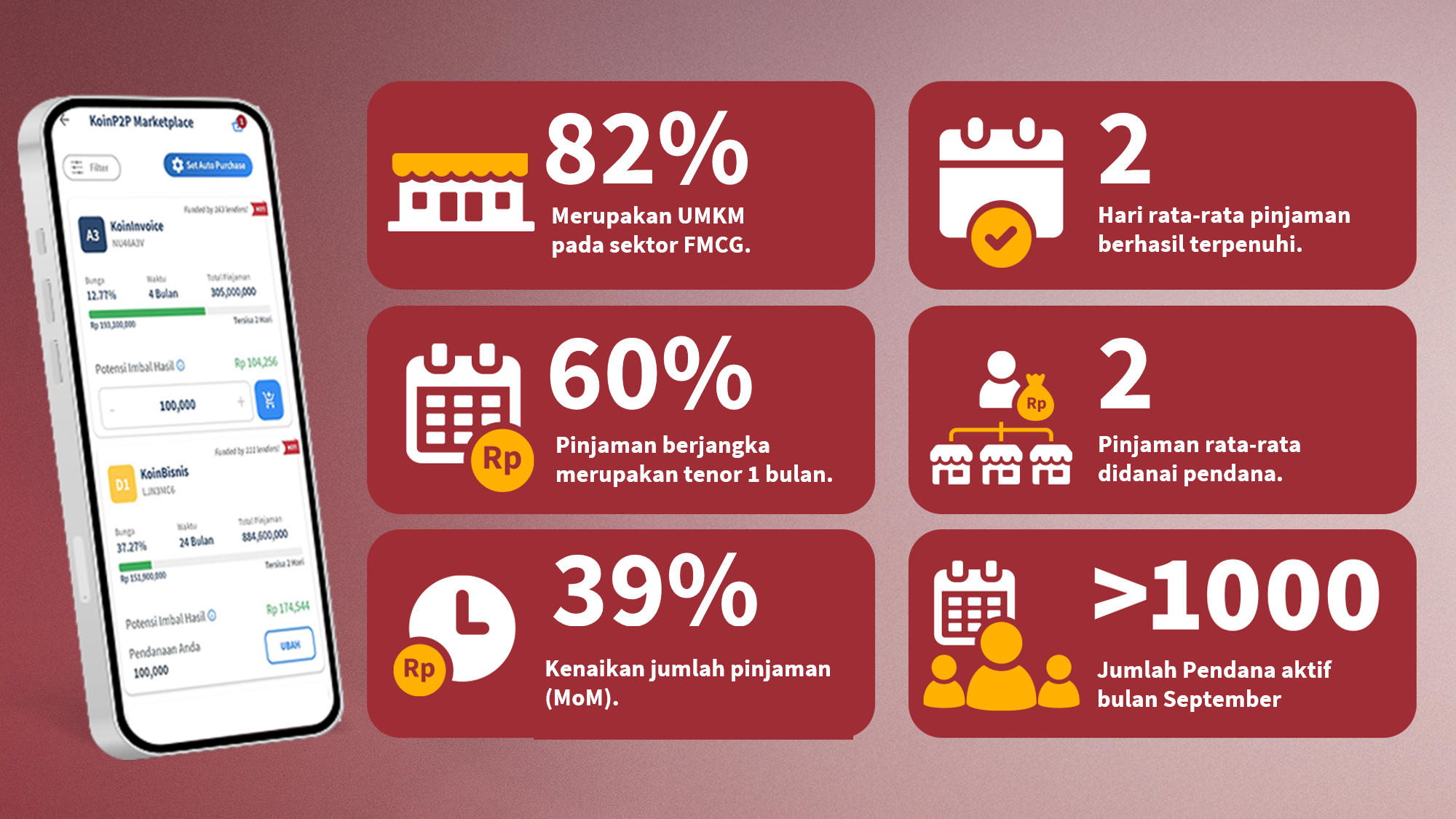 Mayoritas pinjaman berasal dari sektor FMCG (82%), dengan 60% pinjaman berjangka 1 bulan. Rata-rata pinjaman tersalurkan dalam waktu 2 hari dan ada kenaikan jumlah pinjaman sebesar 39% Month-on-month (MoM). Partisipasi pendana juga terjaga, dengan lebih dari 1.000 pendana aktif menyalurkan dana pada, dan rata-rata setiap pendana mendanai 2 pinjaman. Dukungan yang konsisten ini menunjukkan komitmen pendana dalam membantu UMKM tumbuh, sekaligus memanfaatkan potensi imbal hasil yang kompetitif di KoinP2P.