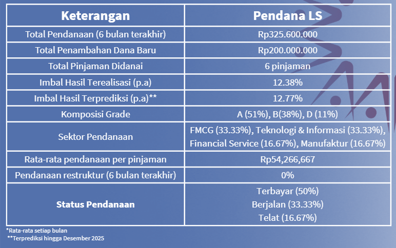 Dari sisi performa, LS mencatat 50% pinjaman telah lunas, 33,3% masih berjalan, dan 16,7% mengalami keterlambatan bayar. Walaupun ada sebagian pinjaman yang telat, LS tetap membukukan imbal hasil terealisasi sebesar 12,83% p.a. dan proyeksi 12,77% p.a. hingga Desember 2025. Angka ini memperlihatkan bagaimana diversifikasi lintas grade mampu memberikan hasil yang konsisten, sekaligus membuka ruang untuk potensi keuntungan lebih tinggi.