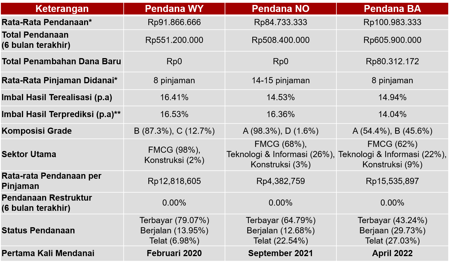 Dari sisi performa, BA mencatat 43% pinjaman telah lunas, 29% masih berjalan, dan 27% mengalami keterlambatan. Meskipun tingkat telat bayar lebih tinggi dibanding dua pendana lain, BA tetap membukukan imbal hasil terealisasi sebesar 14,94% p.a. dan prediksi imbal hasil 14,04% p.a. hingga Desember 2025.