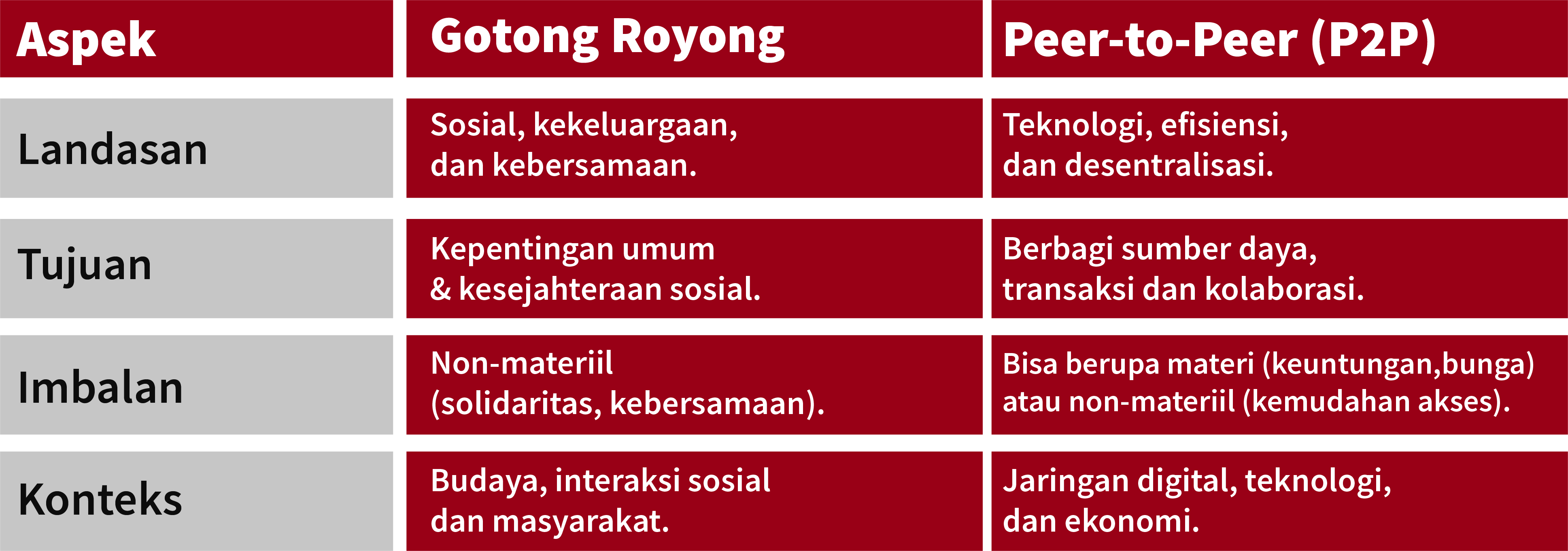Gotong royong mengingatkan kita bahwa kita adalah makhluk sosial yang butuh saling bahu-membahu. P2P menunjukkan bahwa semangat kolaborasi itu juga bisa diterapkan dalam dunia yang paling modern sekalipun. Keduanya adalah bukti bahwa kita tidak harus selalu bergantung pada satu pihak, melainkan bisa saling menguatkan.