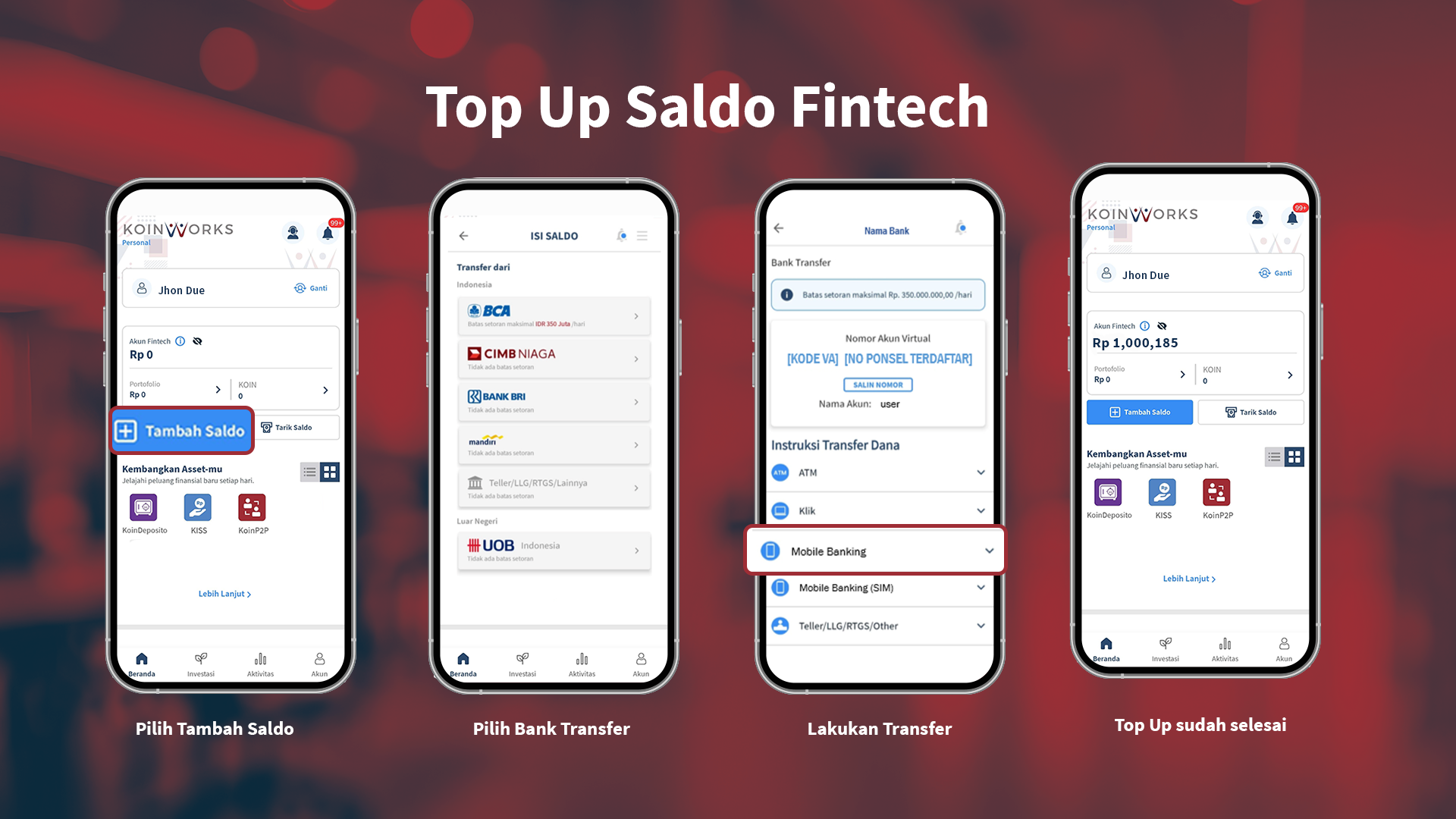 Pastikan saldo mencukupi sebelum mendanai. Gunakan Virtual Account Bank yang tersedia atau metode Teller/LLG/RTGS/Lainnya. Saldo akan masuk ke cash balance di aplikasi KoinWorks.