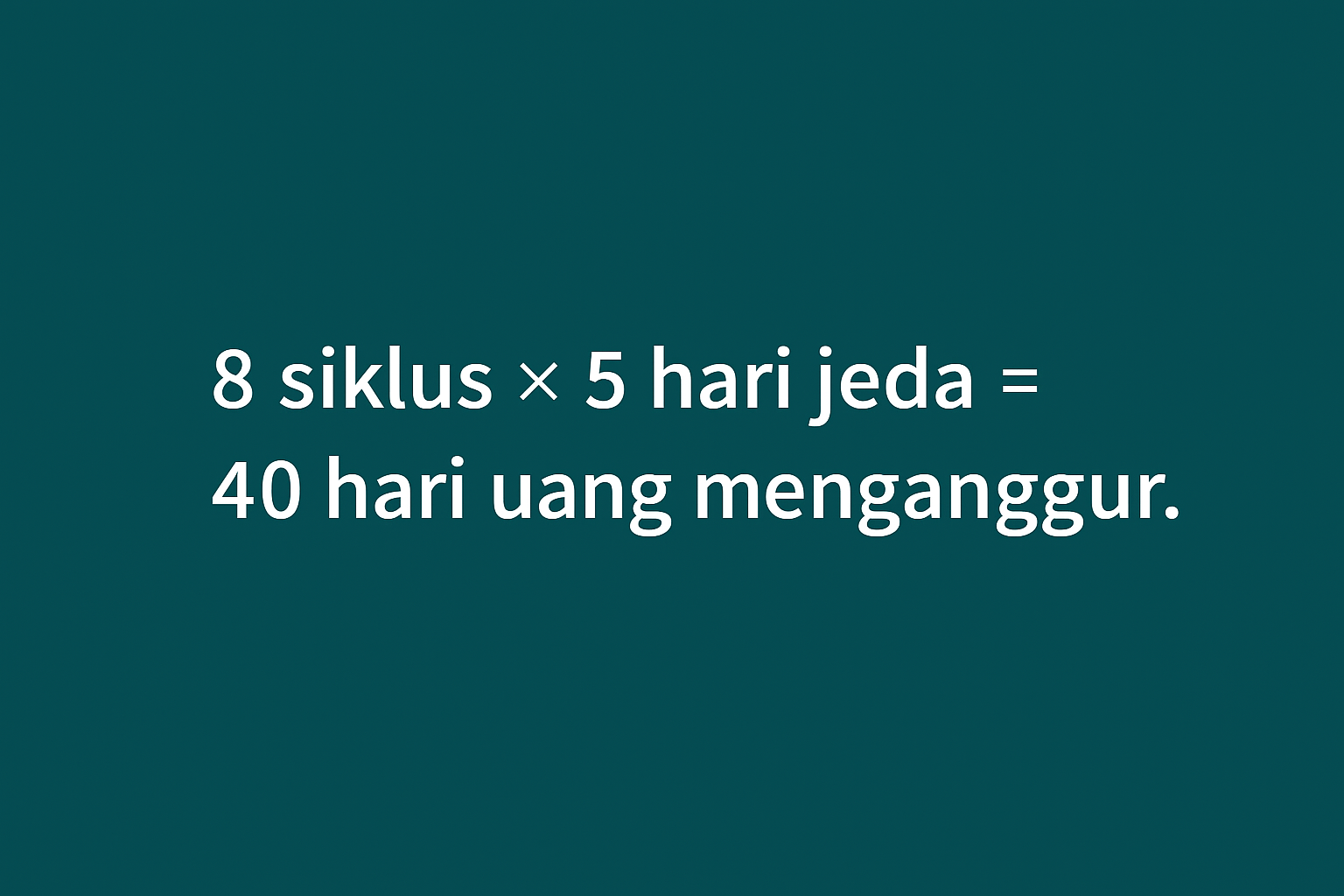 Bayangkan ini: Jika Anda harus mengulang siklus pendanaan pendek (misalnya, 3 bulan) sebanyak 8 kali dalam 24 bulan, dan setiap pengulangan menyebabkan jeda Cash Drag 5 hari.